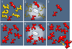 1-Les bactéries normales (jaunes) et mutantes (résistantes ici en rouges) se multiplient à un rythme très élevé. |