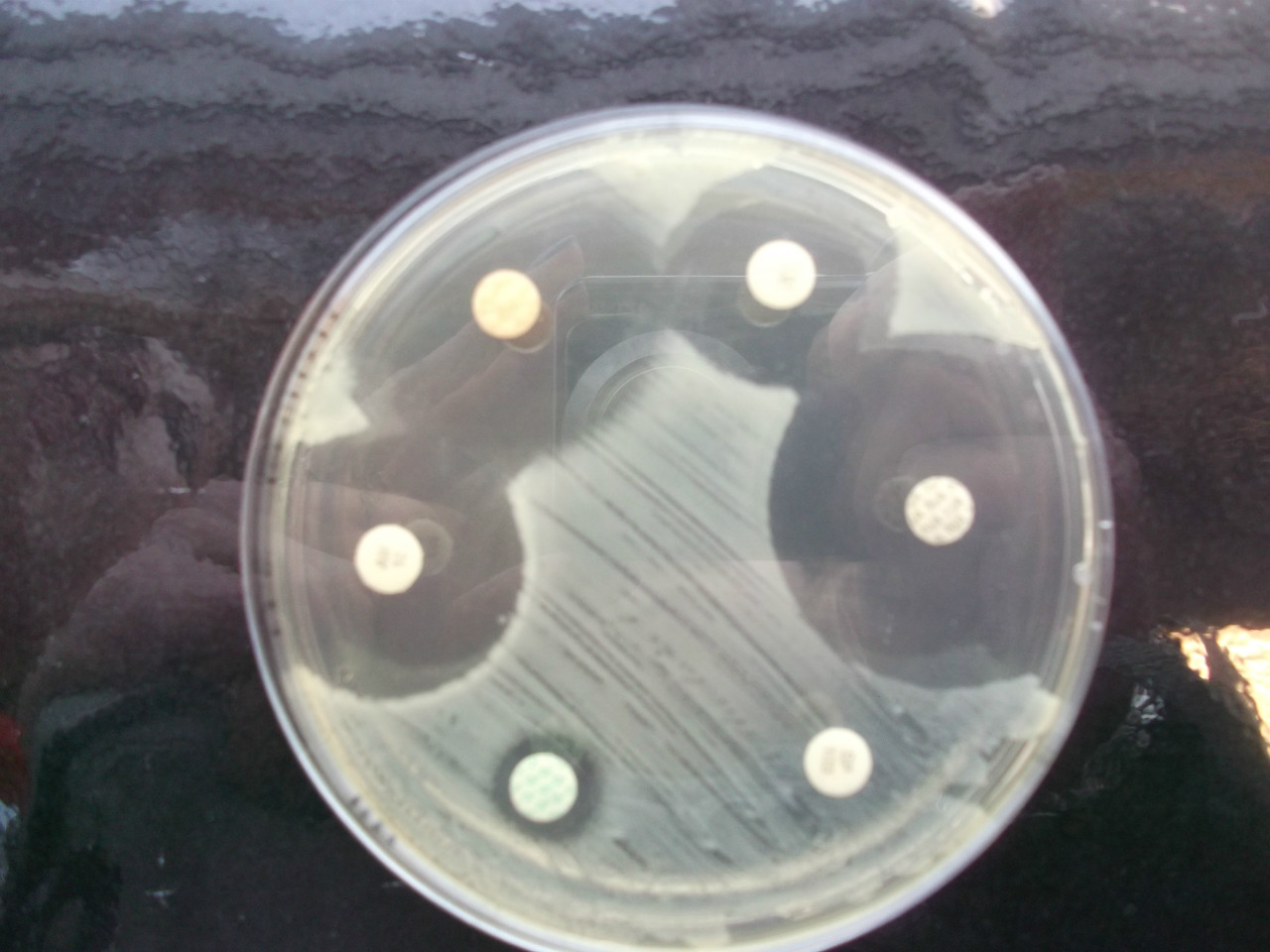 Ceci est le résultat de notre antibiogramme après 48h d'attente. On remarque que la bactérie E.coli est plus ou moins sensible à quatre antibiotiques et résistante à deux antibiotiques.